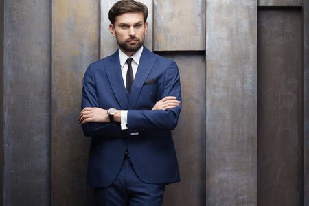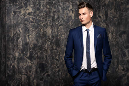 business man in blue suit standing on a concrete wall background.
