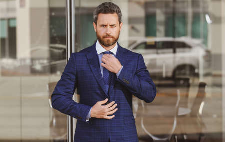 handsome ceo in suit on sky background. ceo in suit outdoor. ceo in business suit. photo of ceo in suit.