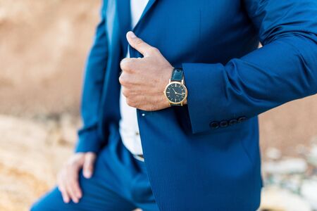 business man hand in pocket with wrist watch in a business suit close up