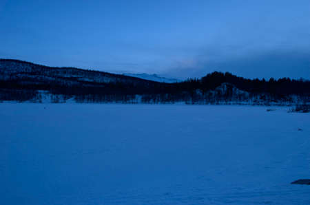 Sunrise, sunset picture in winter, in Scandinavia. Snowie mountains and trees. Travel photography, copy space.