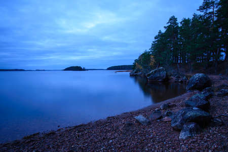 Pine trees on the cliffs of the lake at evening time. Finland.