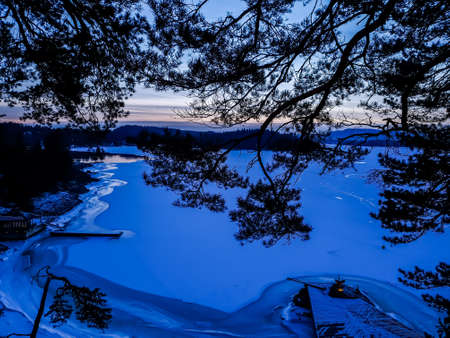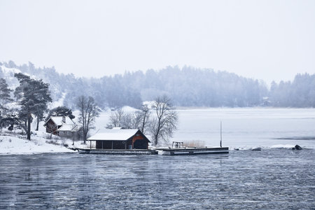 Sweden house in the wintertime. Nature on the shore of the fjord.