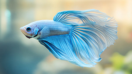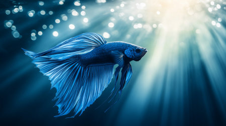 Beautiful blue betta fish gliding through serene underwater scenery, showcasing vibrant fins and a peaceful atmosphere enhanced by soft rays of light.
