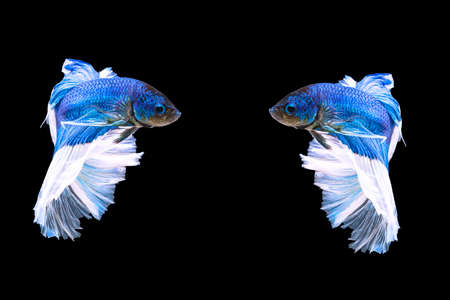 Two betta splendens fighting fish in Thailand on isolated black background. The moving moment beautiful of blue&white Siamese betta fancy fish with copy space.