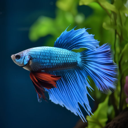 Blue Siamese Fighting Fish, Rosetail Halfmoon Aquarium Pet, Blue Red Betta Splendens in Fish Tank Closeup, Generative AI Illustration