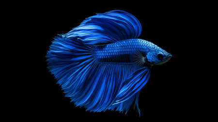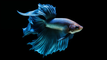 A stunning portrait of a vibrant blue betta fish gracefully swimming against a black background, showcasing its beautiful fins and serene elegance.
