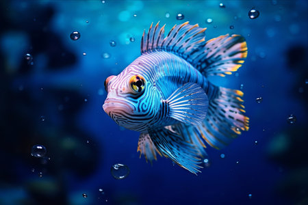 A captivating view of lionfish swimming in blue ocean waters, showcasing their stunning colors and intricate patterns while surrounded by serene bubbles and currents.