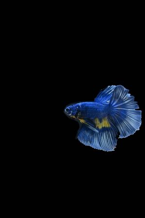 Betta splendens fighting fish in Thailand on isolated black background. The moving moment beautiful of blue&black Siamese betta fancy fish with copy space.