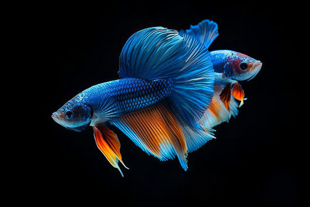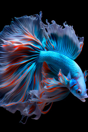 The Enchanting Chase: Capturing the Dynamic Blue Dolphin of the Betta Fish Against a Mysterious Black Backdrop --AR 3:2