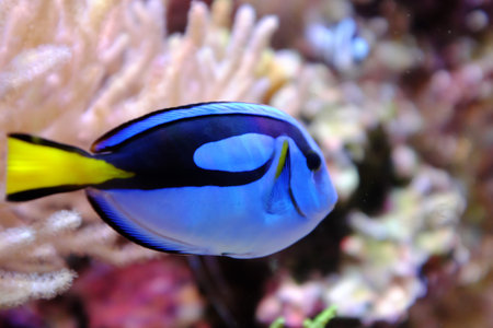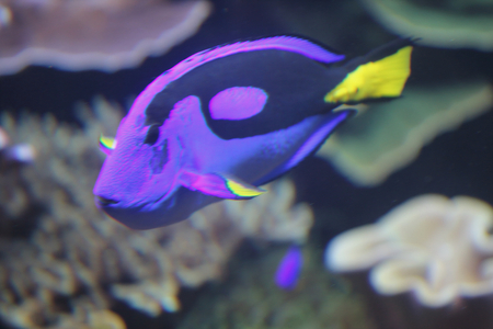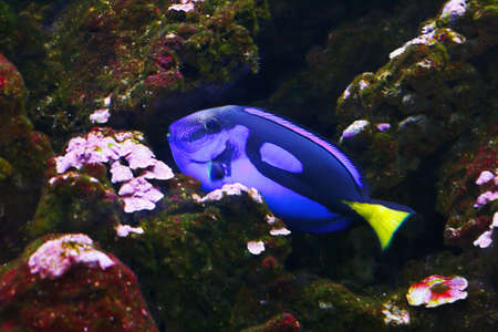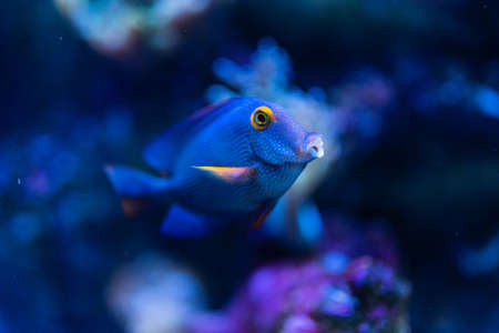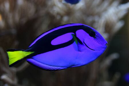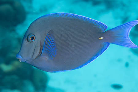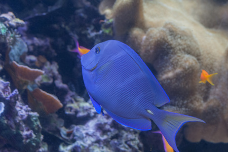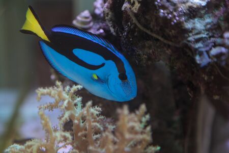 Blue hippo tang fish swimming in a reef in the ocean. Close up. . High quality photo