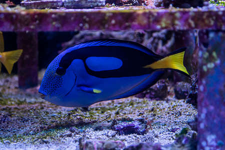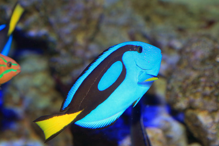 Blue Tang fish swims in a large aquarium with other fish