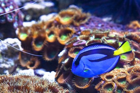 tropical fish in an aquarium with corals and tropical fish.