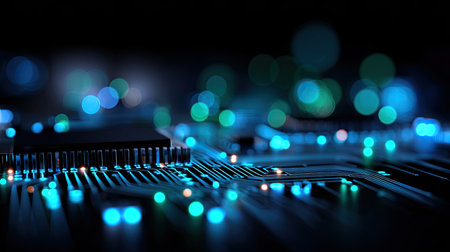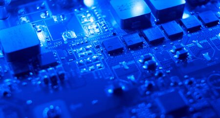 Electronic blue circuit board, computer microcircuit top view, selective focus. The concept of microprocessors, microchips, printed electronic circuits, technology, cybersecurity