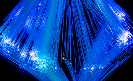 Close up and abstract style capturing the ends of many illuminated fibre optic light strands with vibrant blue light.
