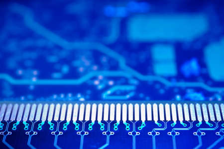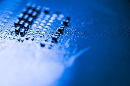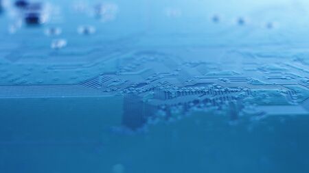 Dark blue computer motherboard closeup in tilt shift style. Selective focus, defocused