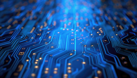 Close-up view of an abstract circuit board design featuring glowing blue lights and intricate connections, representing technology and innovation themes.