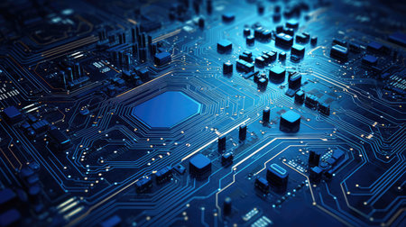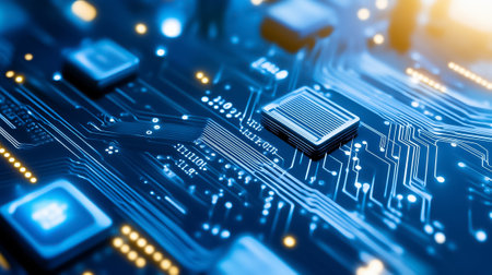 Intricate circuit board featuring microchips and glowing blue lights, symbolizing advanced technology and digital innovation in modern electronics design.