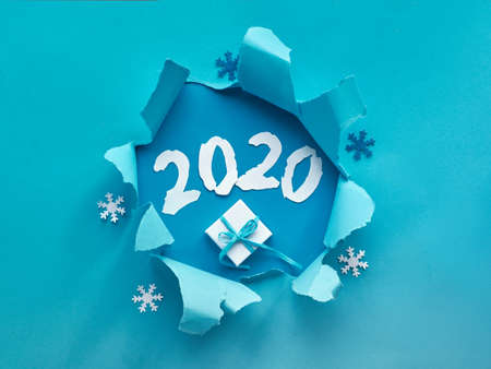 Blue paper flat lay with snowflakes and ripped hole in the middle. In the hole there are New Year's gift and paper number 2020. Happy New Year 2020!