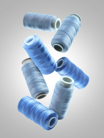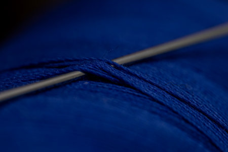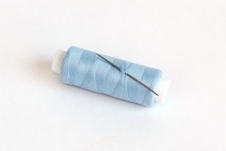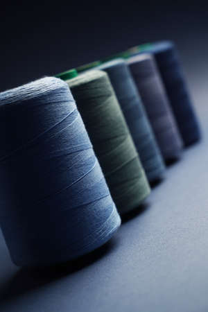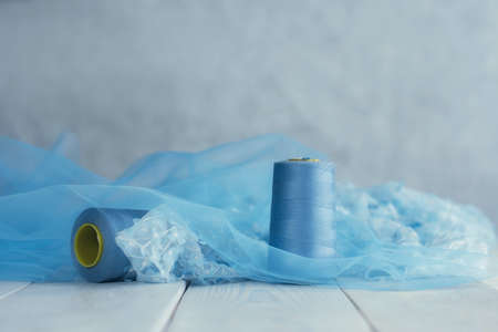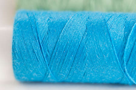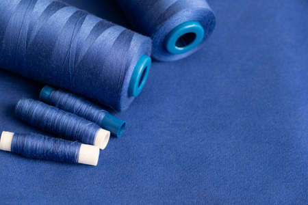 Blue sewing thread close-up with copy space. The thread is made of cotton and synthetics for the production of clothing.
