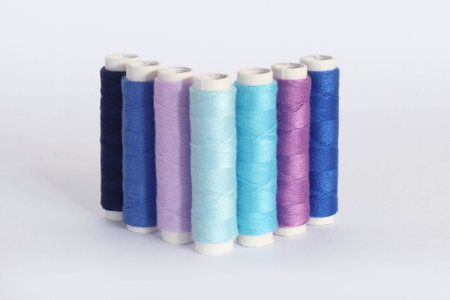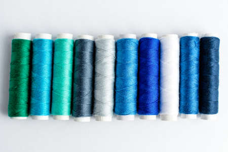 One line of mixed colourful blue spools of cotton thread displayed horizontally, isolated on white, top view
