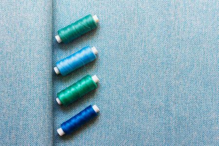 Texture of blue fabric cloth textile with a fold, four green blue sewing threads and copy blank space for text.