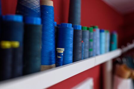 Colored thread on a wooden table for sewing close-up. Art soft focus.