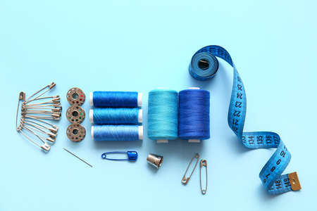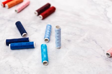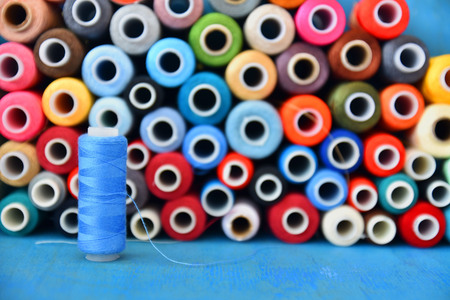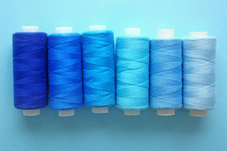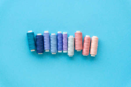 Multicolor sewing threads on a blue background with a copy space for text, concept of sewing threads