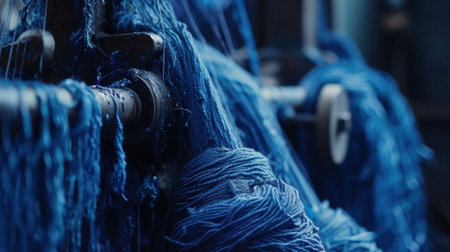 Innovative textile production, spools of blue yarn winding on traditional machinery