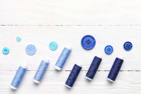 assorted of blue-gray thread spools on table, needlework and tailoring concept