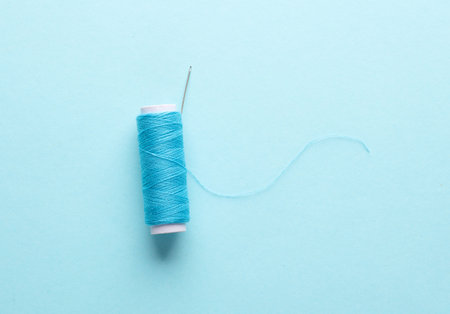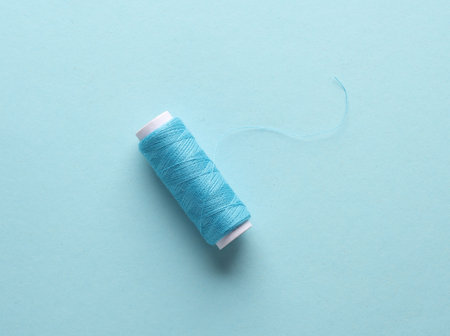 texture of blue thread in spool for sewing on a plain blue background. close up. clothing sewing material pattern