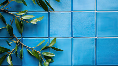 Olive branch on background of blue ceramic tiles. Empty copy of space and template. AI Generated