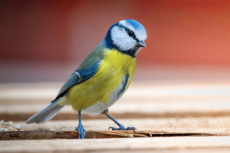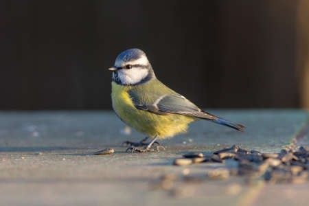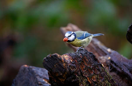 A blue tit (Cyanistes caeruleus) sitting on a piece of wood eating