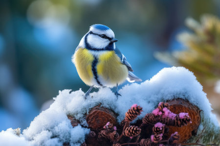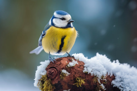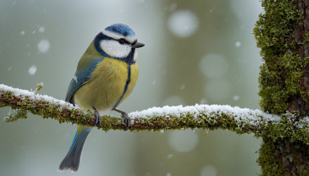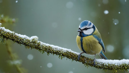 A beautiful winter scene with a cute Blue Tit bird perched on a lichen-covered branch, surrounded by snowflakes in a snowy forest. The first snowfall of the season brings a magical touch to this image. Perfect for winter-themed designs and nature lovers