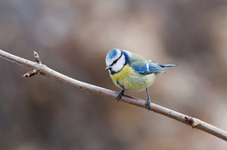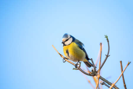 Cute bird, Eurasian blue tit, songbird sitting on a branch without leaves in early spring. The Eurasian blue tit, lat. Cyanistes caeruleus