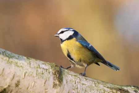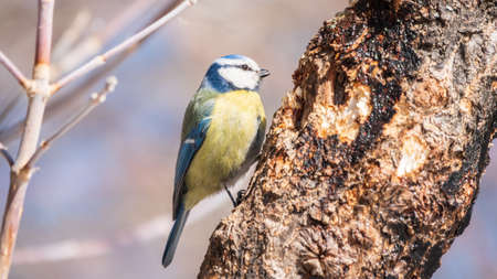 Colorful blue tit (Cyanistes caeruleus)perched on a tree trunk, photographed in horizontal