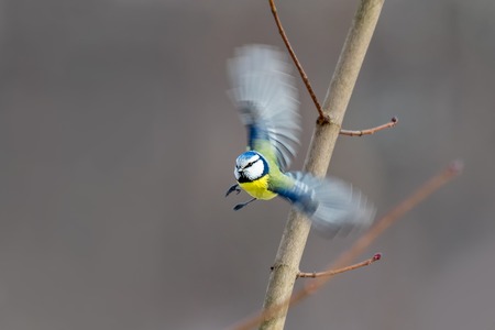 Amazing shot of a Eurasian Blue Tit in flight with wings in blurred motion. Almost impossible shot.