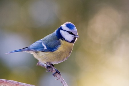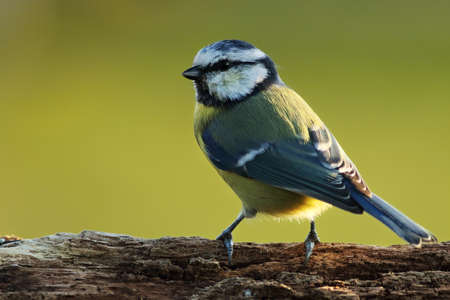 The Eurasian blue tit (Cyanistes caeruleus) on the branch in the morning sun up to close. Old brown branch, green and yellow background.