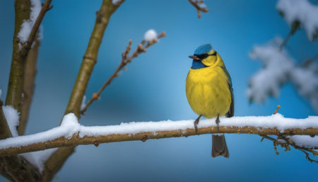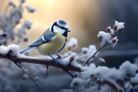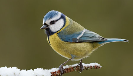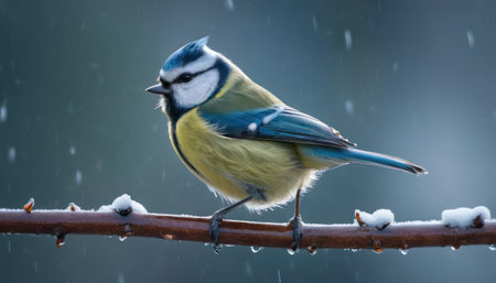 Blue tit (Cyanistes caeruleus) sitting on a branch in the snow