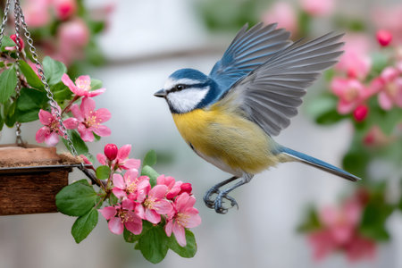 Eurasian blue tit flying near pink blossom and a bird feeder in springtime