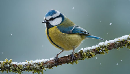 A small blue tit bird with vibrant yellow and blue plumage sits on a moss-covered branch dusted with snow during a gentle snowfall.