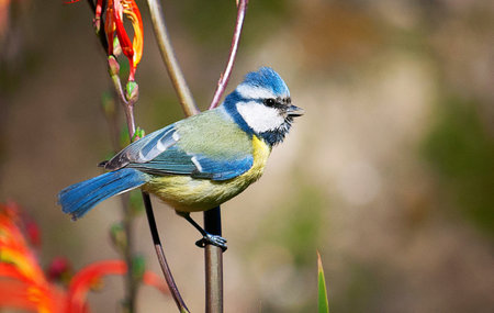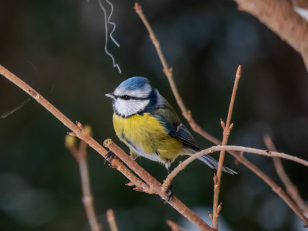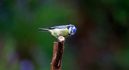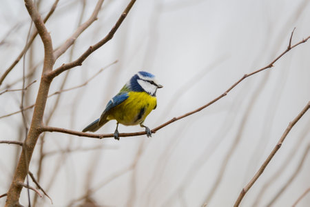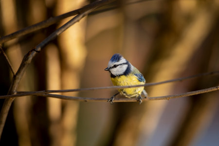 A beautiful and cute Eurasian blue tit (Cyanistes caeruleus) in its natural environment. The small songbird, with its vibrant blue and yellow plumage, perches gracefully on a branch