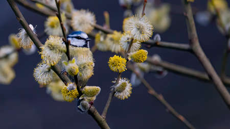 Blue tit on branch in the spring with beautiful yellow flowers.