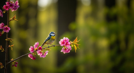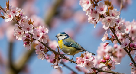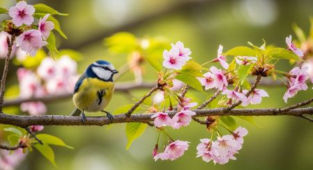 Eurasian blue tit perched among delicate pink cherry blossoms