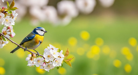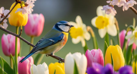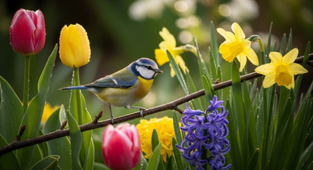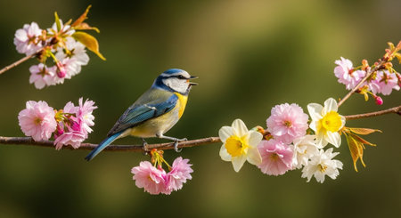 Blue tit perched amongst spring blossoms and vibrant daffodils