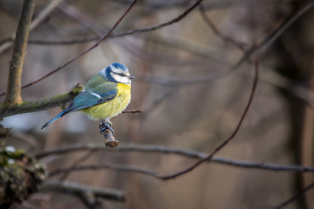 Eurasian Blue Tit (Cyanistes caeruleus) sittting on a branch with blurred background in a park in winter