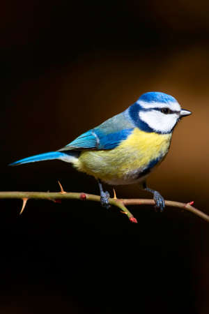 Eurasian blue tit, Cyanistes caeruleus, sitting in branches, closeup portrait, selective focus, shallow DOF