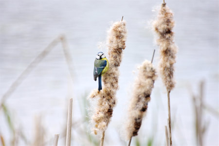 One Blue tit, cyanistes caeruleus, bird perches on bulrush or cotton cattail reeds by water in British wildlife scene. UK countryside