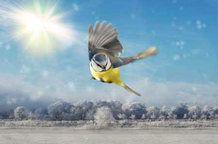 Eurasian blue tit (Cyanistes caeruleus) in winter, Italy.