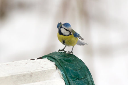 Beautiful eurasian blue tit, Cyanistes caeruleus, in winter in winter during a snowfal.