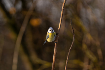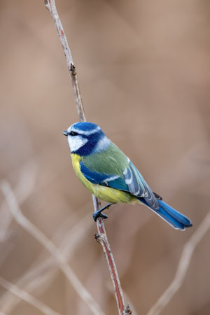 Eurasian blue tit (Cyanistes caeruleus or Parus caeruleus) sitting on a branch with a blurred background